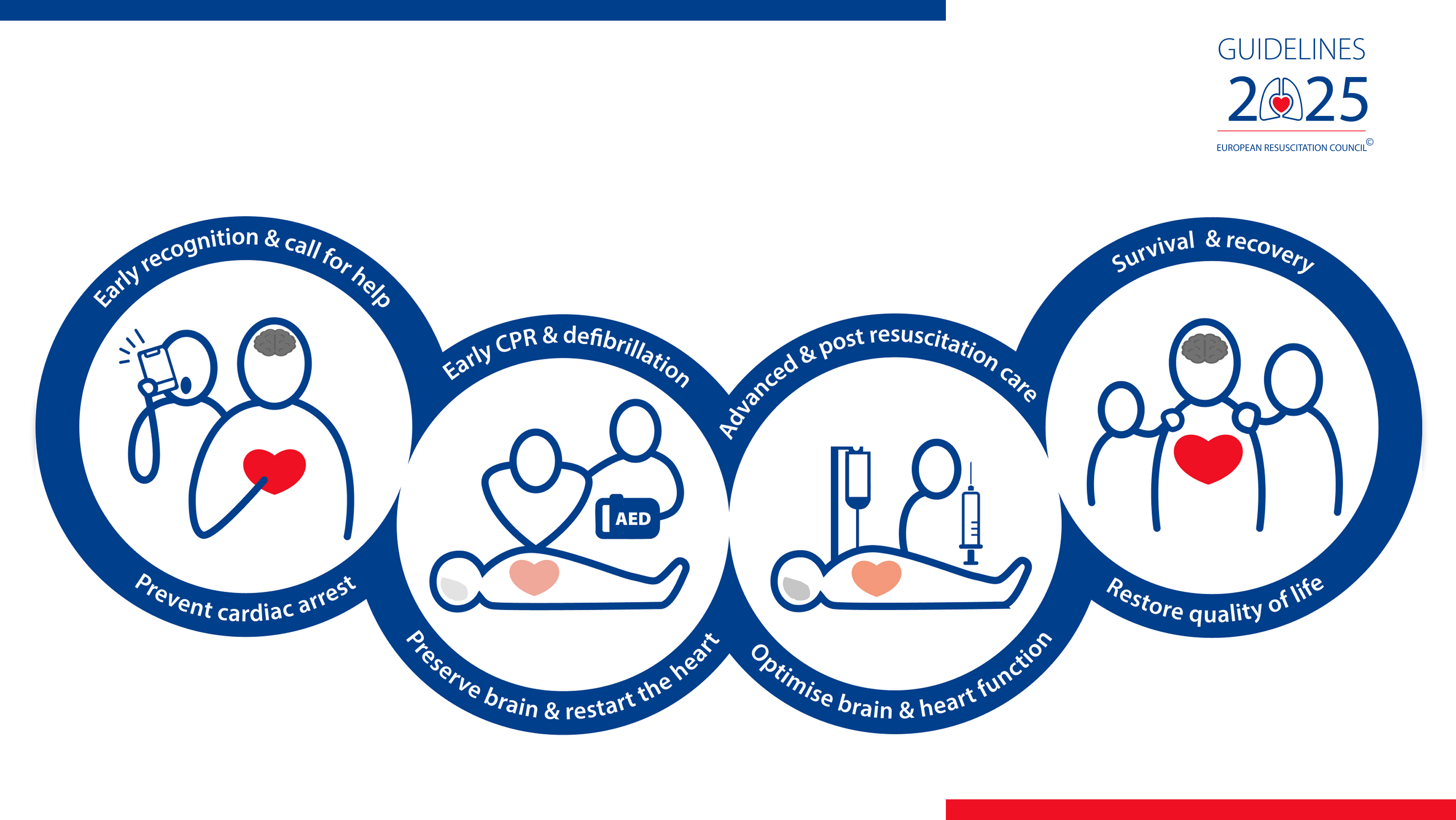 The European Resuscitation Council presents this brochure about the 2025 Guidelines on Cardiopulmonary Resuscitation (CPR). It has been written and produced for the general public, describing the immediate responses needed when someone experiences a cardiac arrest. What happens in the first few minutes is a matter of life and death.